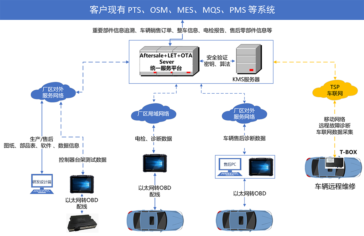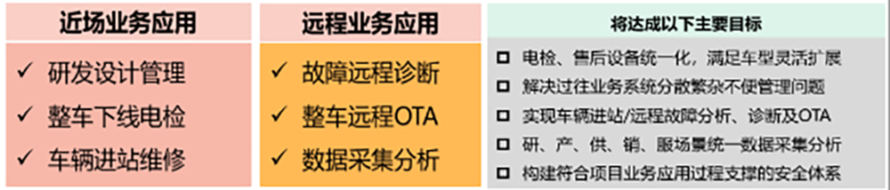 该平台将为客户实现整车下线电检业务与售后诊断服务提供统一平台支撑,覆盖包括车型研发设计验证、整车下线电检、售后进站诊断、故障远程诊断、整车远程 OTA以及整车数采分析等业务应用场景。满足用户灵活配置新车型及整车电器架构的管理配置。为客户提供准确、快捷及稳定的生产电检服务和车辆售后诊断服务保障。
